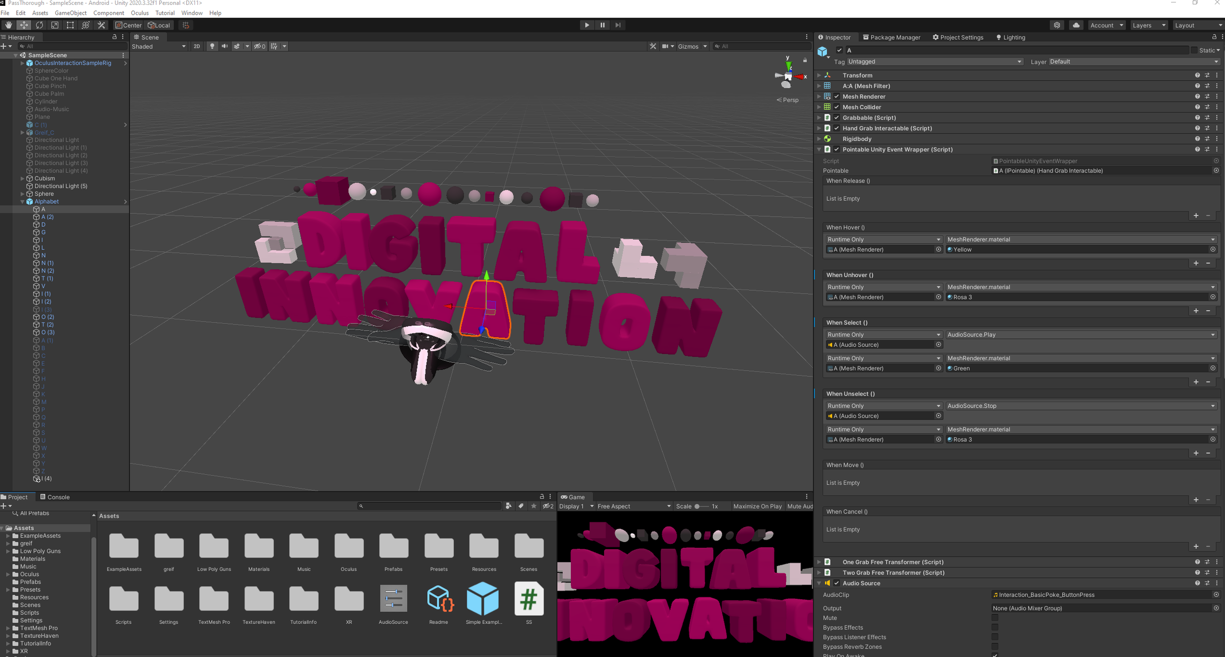 Sometimes when you put on the headset and enter a VR world, you can feel trapped and sometimes anxious or afraid of not being able to see reality. That's where Pass Through can help. What does it mean? It means that you can look around even though you have the headset on. In the project, you can see the actual room you are in physically and play with the letters and shapes in the air using just your hands. You can also scale them.